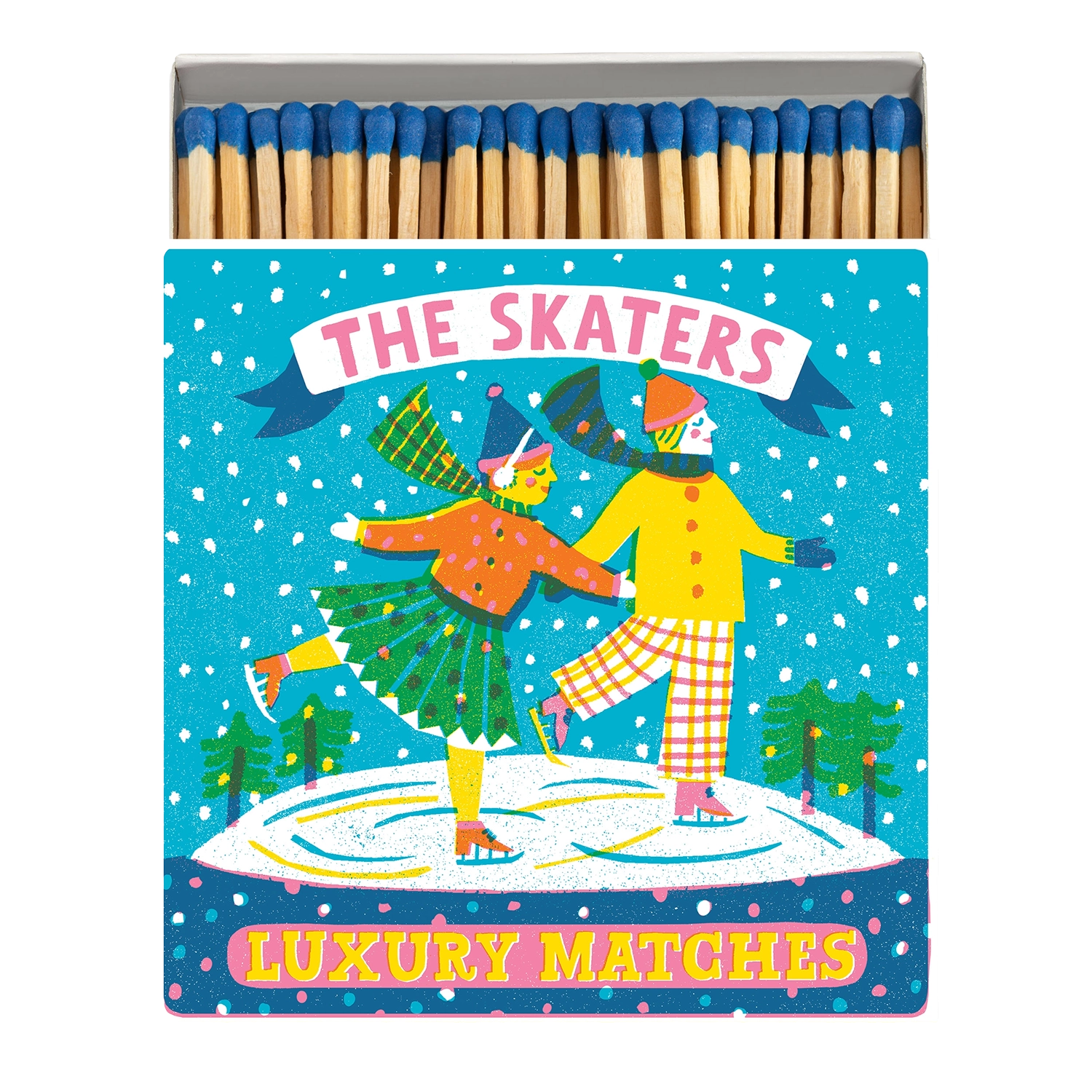 Značilna kvadratna škatlica z vžigalicami z dvema drsalcema, zavitima v kape in šale, z napisom »The skaters, luxury matches«.