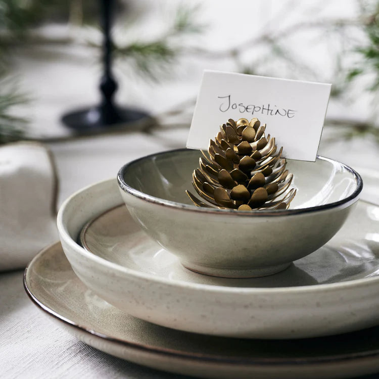 Dopolnite postavitev mize s tem ročno izdelanim držalom v obliki stroža. Je tisti dodaten detajl za božično zabavo ali božični večer. Dodajte majhno kartico z imenom gosta in ga postavite na krožnik. Enako je idealen kot okras, ki se uporablja kot del osrednjega dela ali v izložbi na polici. S svojo zlato barvo in klasično obliko borovega storža dopolnjuje vsakršen dekor – od klasičnega do nenavadnega in minimalističnega.