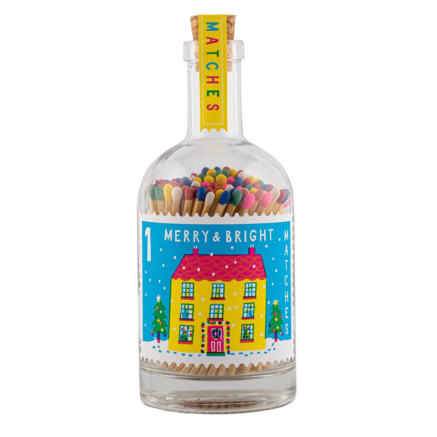 Naša steklenička vžigalic z etiketo, ki je navdihnjena z vintage znamko in prikazuje rumen dom, okrašen za božič, obdan s snegom, z napisom »Merry & Bright«.